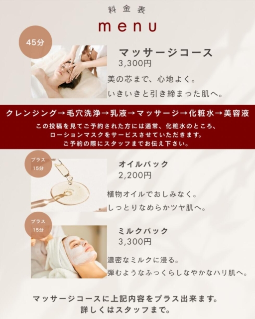 基本のマッサージコースに、オイルパックやミルクパックと