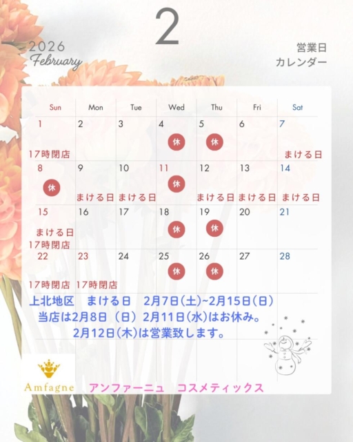 2月より定休日が変更となりますのでお間違えの無いようにご確認お願い致します。